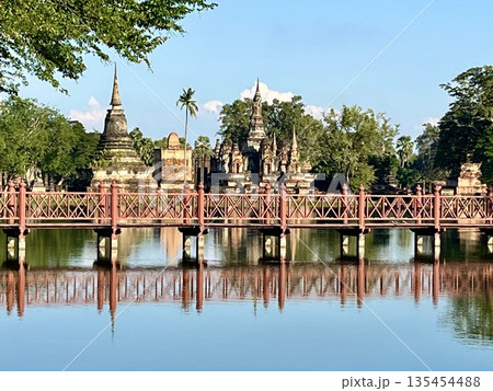 スコータイ歴史公園のワット トラパングーンと水面に映る赤い橋