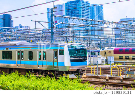 日本の東京都市景観 京浜東北線などを望む。(田町ー高輪ゲ…間)。右はSUNRISE EXPRESS