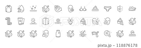 Beauty icons set. Included icon as Pants, Bathrobe and Shirt web elements. T-shirt, Clean skin, Lingerie icons. Shoes, 24 hours, Sleep web signs. Health skin, Vitamin e, Uv protection. Vector