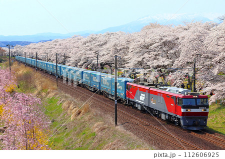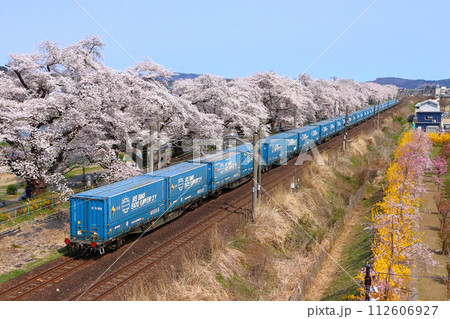 白石川堤一目千本桜を行く東北本線トヨタ・ロングパス・エクスプレス貨物列車