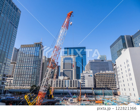日本の東京都市景観新風景。TOKYO TORCH 常盤橋再開発 大手町に巨大鉄骨構造体やクレーン群
