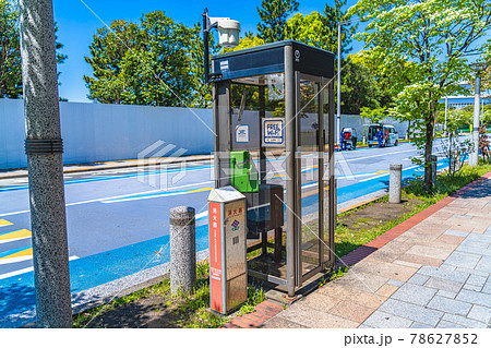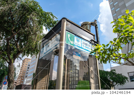 日本の東京都市景観 東京メトロ・浅草駅(出入口)前にある電話ボックスとFREE Wi-Fiなど