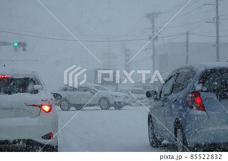 雪の一般道 交差点の信号待ち