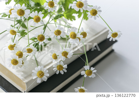 積み重ねた本の上のマトリカリアの小花 春の自然光