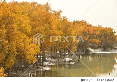 Tarim Huyan Lin Scenic Area in Luntai County, Xinjiang, when the leaves of the Hu Yanglin change color, it appears as a golden yellow. which means "the most beautiful tree," .