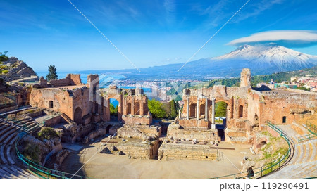 Morning view of ancient Greek theatre in Taormina on background of Etna Volcano, Sicily, Italy