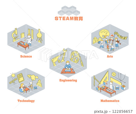 STEAM教育の文字とこどもの未来教育をイメージするアイソメトリック構図のイラスト