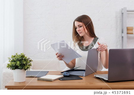 Woman locked herself in the bathroom to work with documents. Work from home