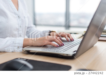Office worker typing, working at her workplace