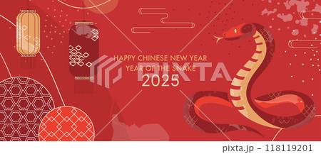 2025 Chinese New Year Banner. Year of the Snake Card Template Design with Golden Red Snake and Traditional Paper Festival Lanterns Background. Traditional Luxury Decorations.
