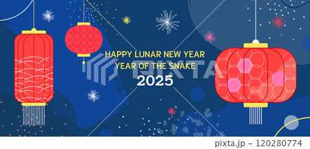 2025 Lunar New Year Banner. Year of the Snake Celebration Design with Red Lanterns, Fireworks, and Traditional Chinese Decorations on Blue Background