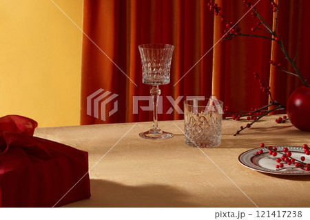 Creative template photo for new year advertising banner design. A new year table setting with wine glasses, porcelain dish, gift box and red flowers. Vacant space in center for product presentation