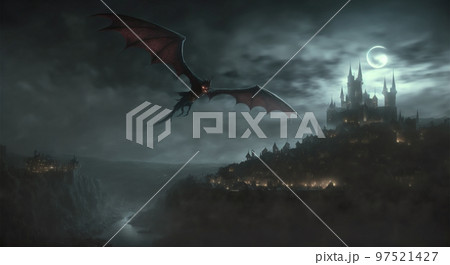 Concept art illustration of black dragon flying over medieval village