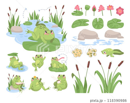 Cartoon frog pond. Green frogs or swamp toads on lily lotus leaves in water, baby tadpole amphibian toad pose jumping catch insect mosquito, comic animal swanky vector illustration