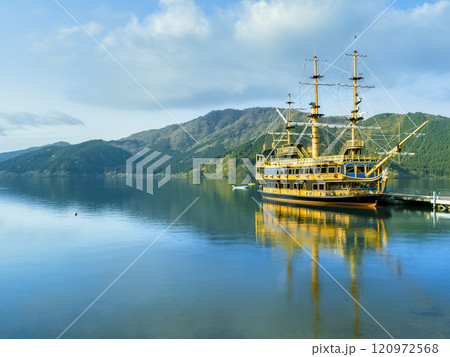 早朝の桃源台港から見る芦ノ湖と遊覧船