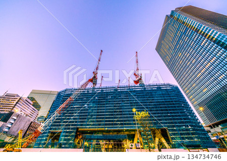 日本の東京都市景観新風景 大手町プレイスや巨大鉄骨構造体、電車、東京駅前のビル群などを望む…新時代へ