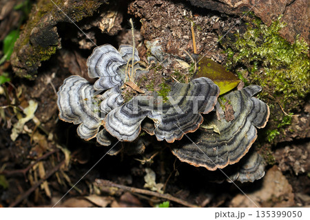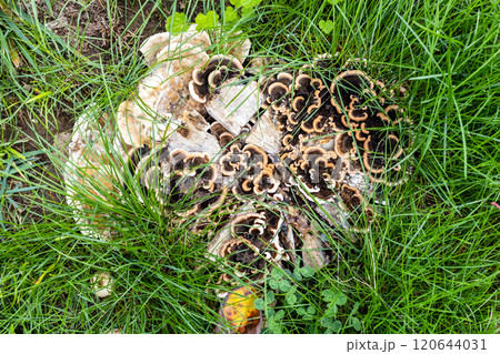 腐る切り株にカワラタケキノコのコロニー(アウトドアフィールド菌・キノコ類マクロ撮影)