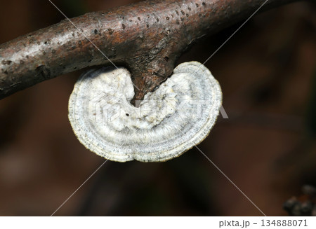 森の倒木に自生している白地に茶褐色の縞が美しいアラゲカワラタケ(キノコ)単体画像。