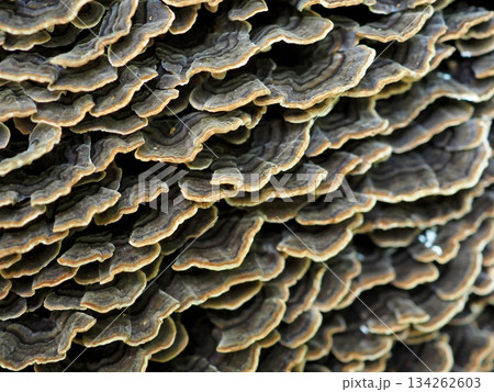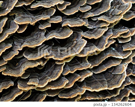 Large layers of fungus on the tree, turkey tail brackets. The botanical name is Trametes versicolor, also known as Coriolus versicolor.