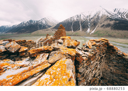 Fortress On Mountain Background Near Karatkau Village, Kazbegi District, Mtskheta-Mtianeti Region, Georgia. Spring, Summer Season. Truso Gorge.