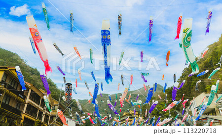 熊本県杖立温泉 春風に楽しく舞う鯉のぼり