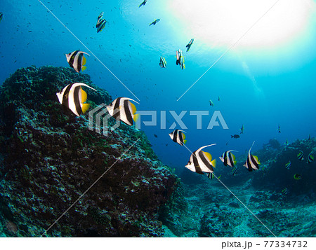 珊瑚礁を泳ぐシテンチョウチョウウオの群れ (ランギロア、ツアモツ、仏領ポリネシア)