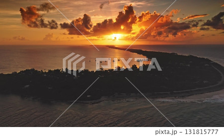 Breathtaking aerial view of small island in Tikehau atoll, French Polynesia, vibrant colorful sunset sky, palm trees and tranquil turquoise waters. Remote wild nature paradise, exotic summer travel
