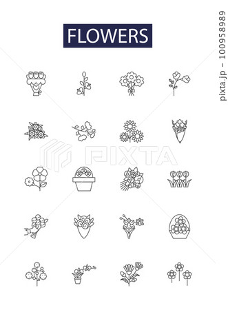 Flowers line vector icons and signs. Petals, Roses, Daisies, Thistles, Flora, Tulips, Stems, Foliage outline vector illustration set