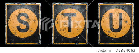 Set of public road sign orange and black color with a capital letters S, T, U in the center isolated on black background. 3d