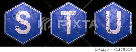 Set of public road sign in blue color with a capital white letters S, T, U in the center isolated on white background. 3d