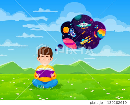 Boy reading a book and dreaming about space planets discovery vector science, education and fantasy. Cartoon kid boy character sitting on green meadow with book and space galaxy adventure dream bubble