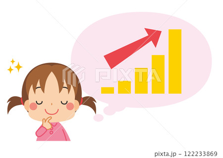 上昇するグラフを思い浮かべて微笑む可愛い小さな女の子のイラスト 白背景 ベクター クリップアート