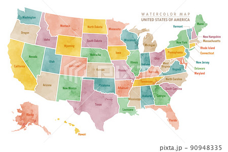 水彩タッチのアメリカ合衆国の地図:カラフル系