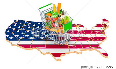 Purchasing power in the USA concept. Shopping cart with American map, 3D rendering