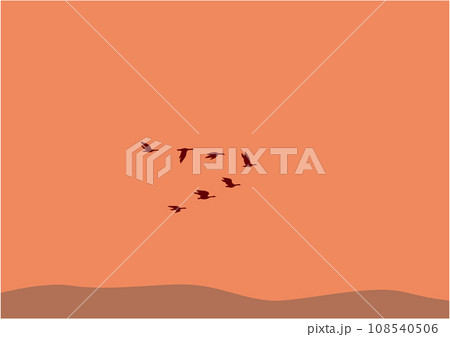 暮れの大地に数羽の渡り鳥が飛んでいるイラスト