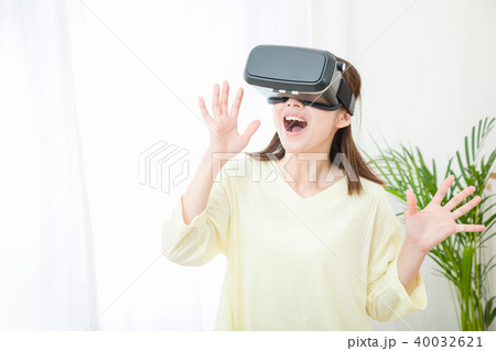 VRゴーグルをつけた女性 仮想現実 VR バーチャルリアリティー 最新技術 仮想現実