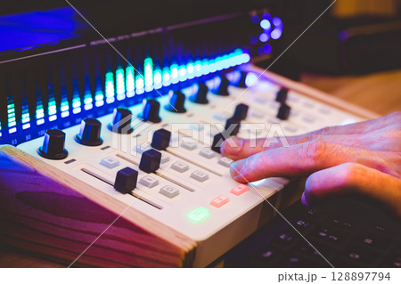 sound engineer hands mixing music on audio mixing console in home studio