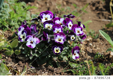 満開のパンジー・ビオラの複色花(薄紫・紫)