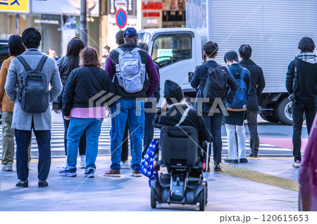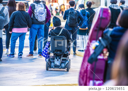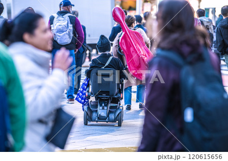 日本の東京都市景観 都会の雑踏の中で…高齢化社会…次世代電動車椅子の高齢女性=東京都内(渋谷駅前)