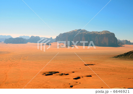 【ヨルダン】広大な砂漠ワディラム、岩山、砂漠、雑草、人影