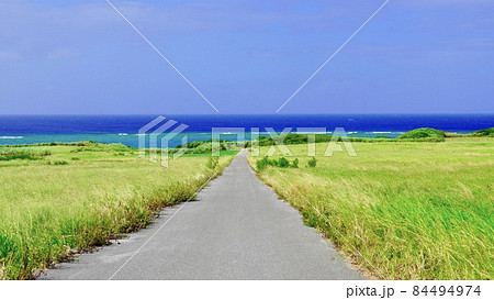 沖縄県伊江島の海へ広がる夏はサトウキビ畑である一本道