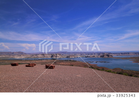 Desert Lake with Blue Water and Red Rock Shoreline at Wahweap Overlook Arizona