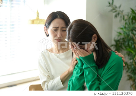 ベンチで泣く親子・生徒・教師の女性(悲しい・トラブル・落ち込む・ショック・絶望・不幸)