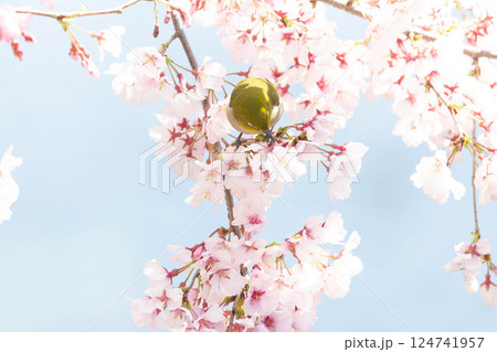 満開の桜の枝にとまるメジロ