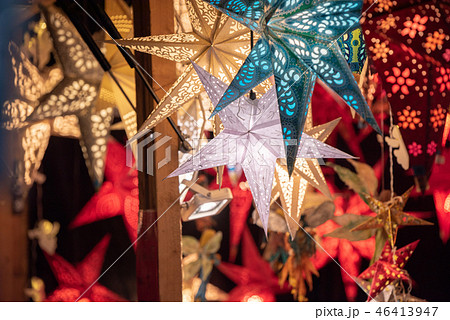 traditional handmade christmas star lanterns in vibrant colors displayed at festive market. High quality photo