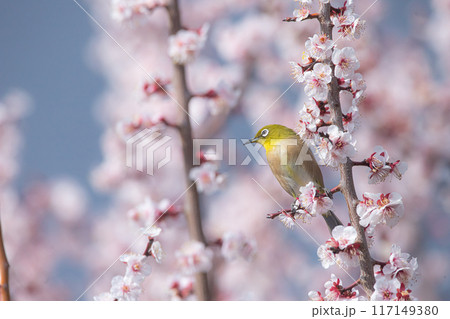 ピンクの河津桜に囲まれたかわいいメジロ 春の風景