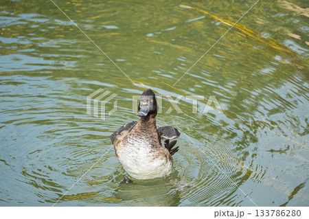 水に浮かびながら身体の手入れをするキンクロハジロ 京都市