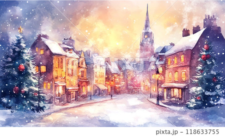 水彩で描いた冬の町並み