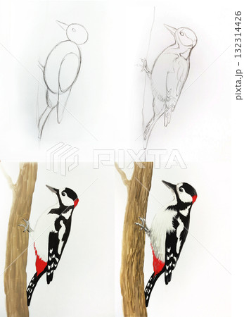 Woodpecker drawing tutorial steps. Bird sketch artwork educational guidance. Art class illustration instruction study. White background step-by-step guide