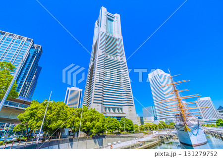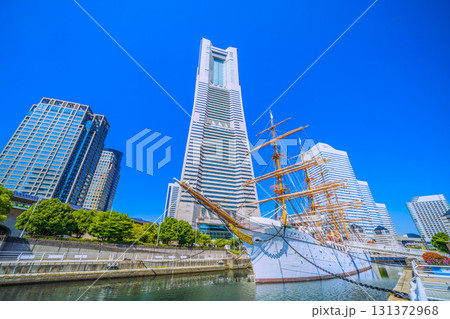 日本の横浜都市景観 帆船日本丸や横浜ランドマークタワーなどを望む